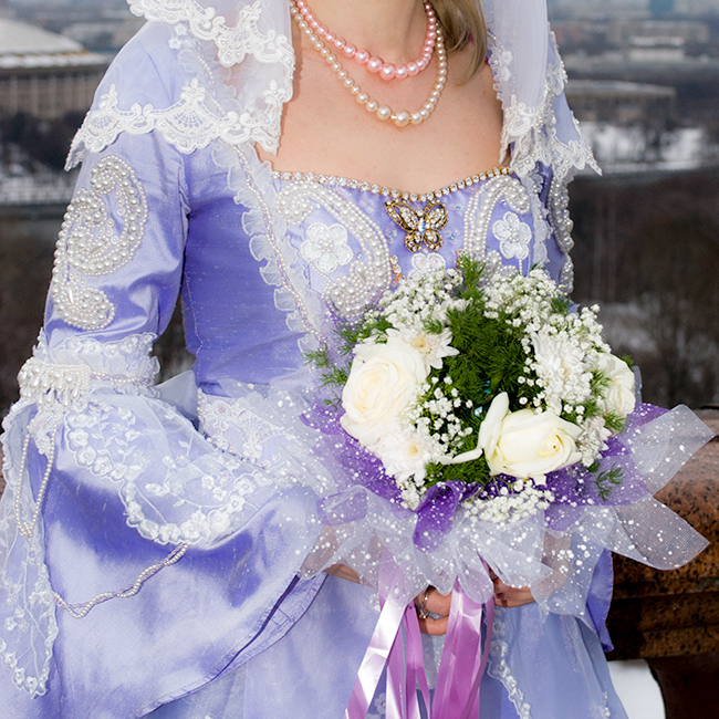 Design Type: Laced embroidery and lavender raw silk. Decorated with over 2000 pearls.